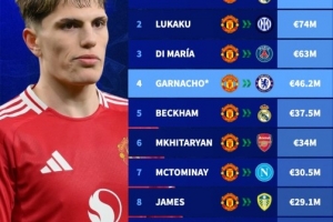 德转晒出曼联出球球员收入的排行榜,加纳乔以4620万欧元转会费成为曼联队史售价第四高的球员。超越了2003年贝克汉姆加盟皇家马德里时的3750万欧元。C罗2009年以9400万欧元转会皇马仍是曼联队史最高售价纪录,德转表示,短期内极有可能无人能超越。