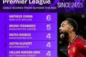 体育资讯10月26日讯 曼联在本轮英超4-2力克布莱顿,库尼亚远射建功。数据统计显示他也是上赛季至今英超禁区外破门次数最多的球员。